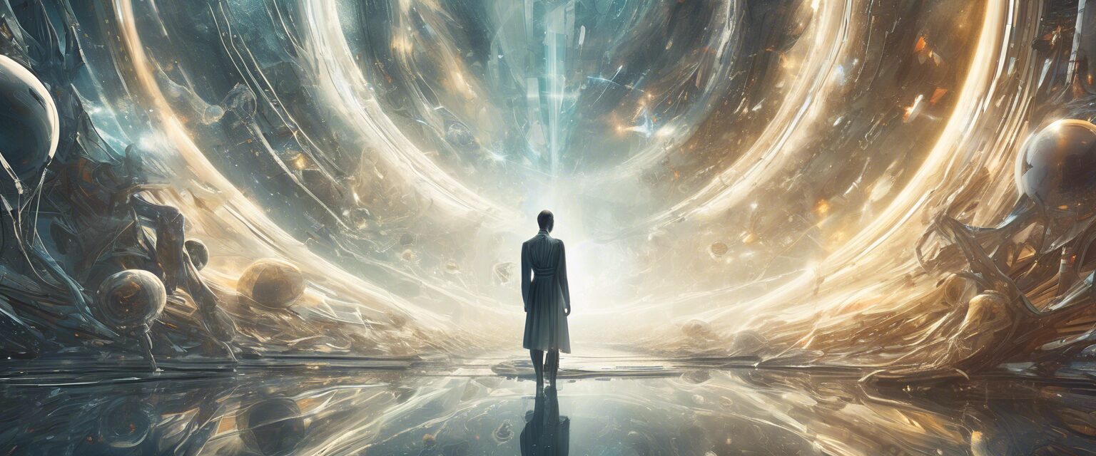 Un ser posthumano en una pose meditativa se encuentra en el epicentro de multirealidades fusionándose, brillando con los detalles intricados de su existencia tecnológicamente avanzada. Los derechos digitales se vislumbran con interfaces holográficas entre los dominios interconectados, representando un futuro inclusivo pero incierto.