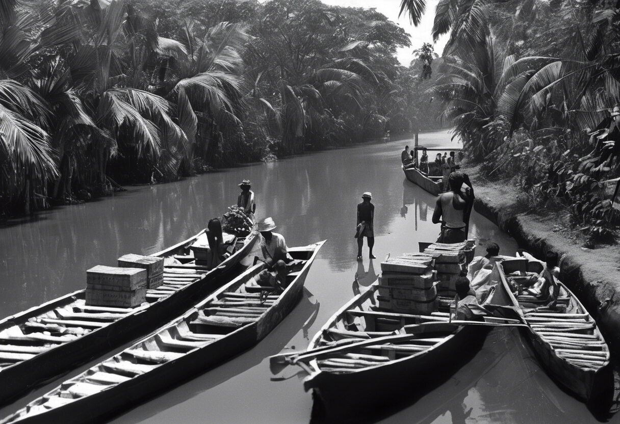 Los trabajadores del Orinoco luchan contra el peso, sus músculos y su ropa evidenciando la dura realidad del transporte de mercancías en el siglo XIX. Una instantánea del tiempo capturada en película, reflejando las luces y sombras de una época pasada.