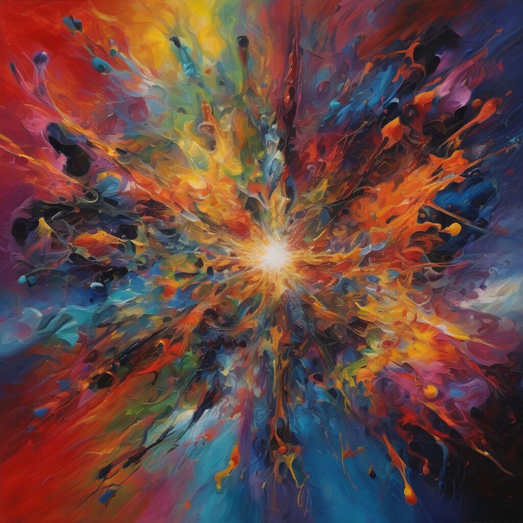 En esta vibrante representación abstracta, “Travesía Transhumana: Evolución en Caos”, Berta explora el concepto de transhumanismo a través de un estallido de colores y texturas firmes y evidentes. Ritmos intensos y audaces se entrelazan para simbolizar la audaz evolución hacia un estado transhumano. Las pinceladas representan el constante avance de la tecnología y la ciencia, mientras que las salpicaduras de colores oscuros sugieren la resistencia y las pruebas que forman parte de este viaje.