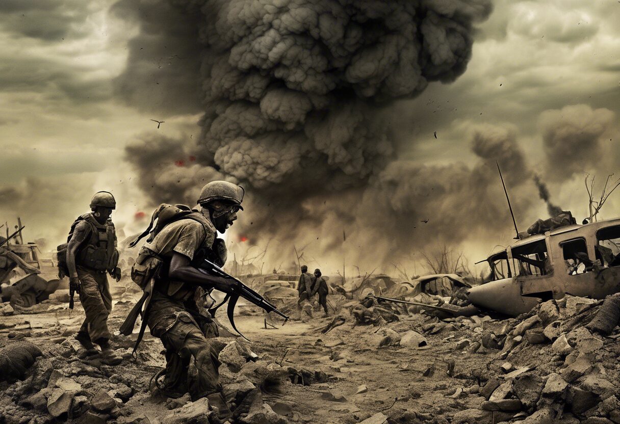 Una impactante representación de la concebible Tercera Guerra Mundial, evocando la mezcla de coraje y desesperación entre las duras realidades del combate. La imagen con textura granulada y tonos parcialmente saturados refleja la grave severidad del conflicto armado, ilustrando la belleza irónica en la devastación.