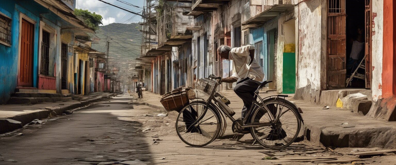 Un inventor local, con sus manos manchadas y su mirada concentrada, representa el espíritu de resiliencia e innovación en medio de una colorida pero desgastada Venezuela. Su creación, un molino de viento improvisado, destaca entre el bullicio del mercado, simbolizando la esperanza en tiempos de adversidades.