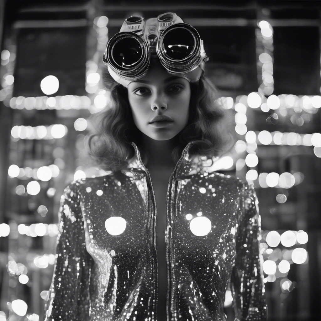 “La confianza y el poder se fusionan en esta imagen en blanco y negro que captura la tensión entre el pasado y el futuro. La modernidad de Venezuela se proyecta en el atuendo vanguardista, mientras que su héritage queda reflejado en la escena cargada de simbolismos indígenas. Un aura futurista envuelve la toma, subrayada por las largas y dramáticas sombras creadas a partir del proceso analógico de negativos de vidrio.”