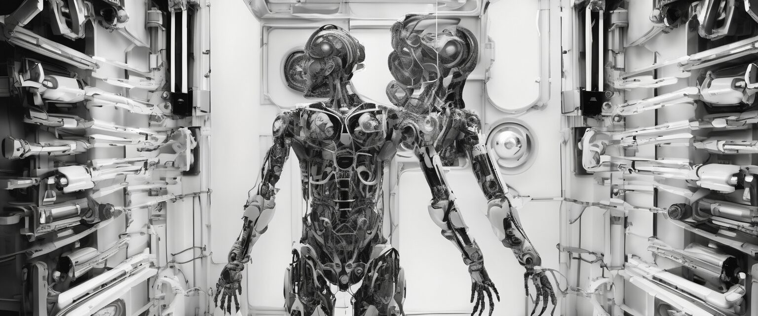 La fotografía es una representación del transhumanismo, la fusión propuesta entre la humanidad y la tecnología. Visualiza la imagen de un cuerpo que combina lo orgánico con lo mecánico, lo natural con lo sintético, presentado en alto contraste de blanco y negro. La obra explora el aspecto conceptual del posthumanismo, marcando la trascendencia más allá de los límites tradicionales de lo que se considera humano y adentrándose en una era de evolución tecnológica.