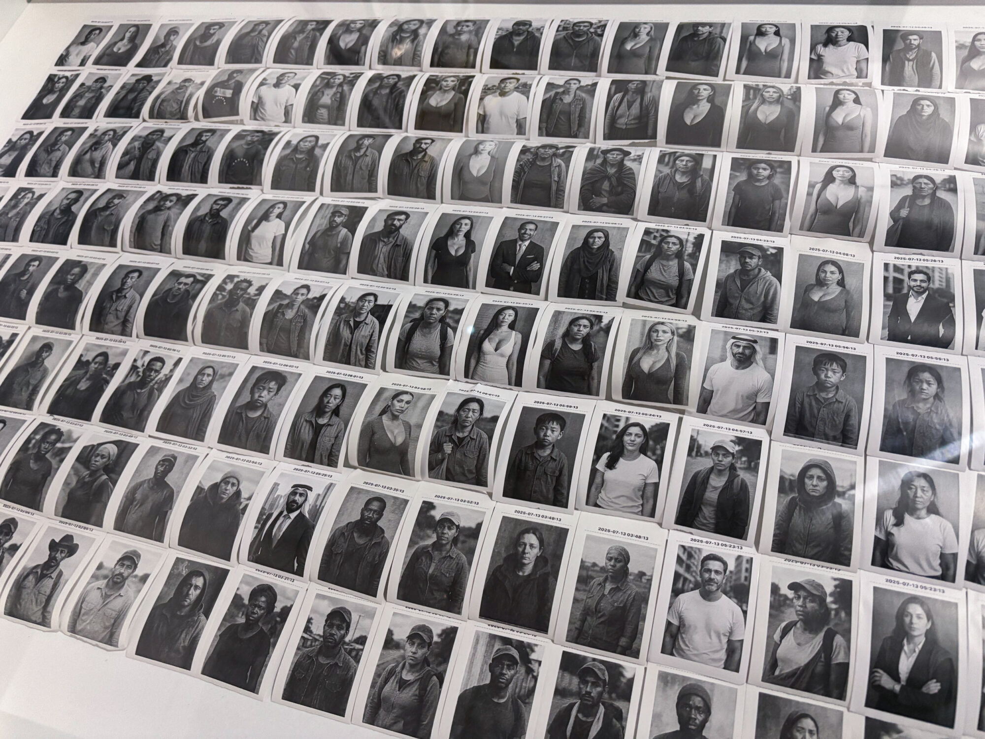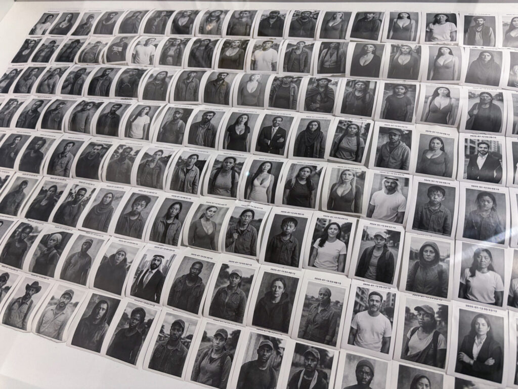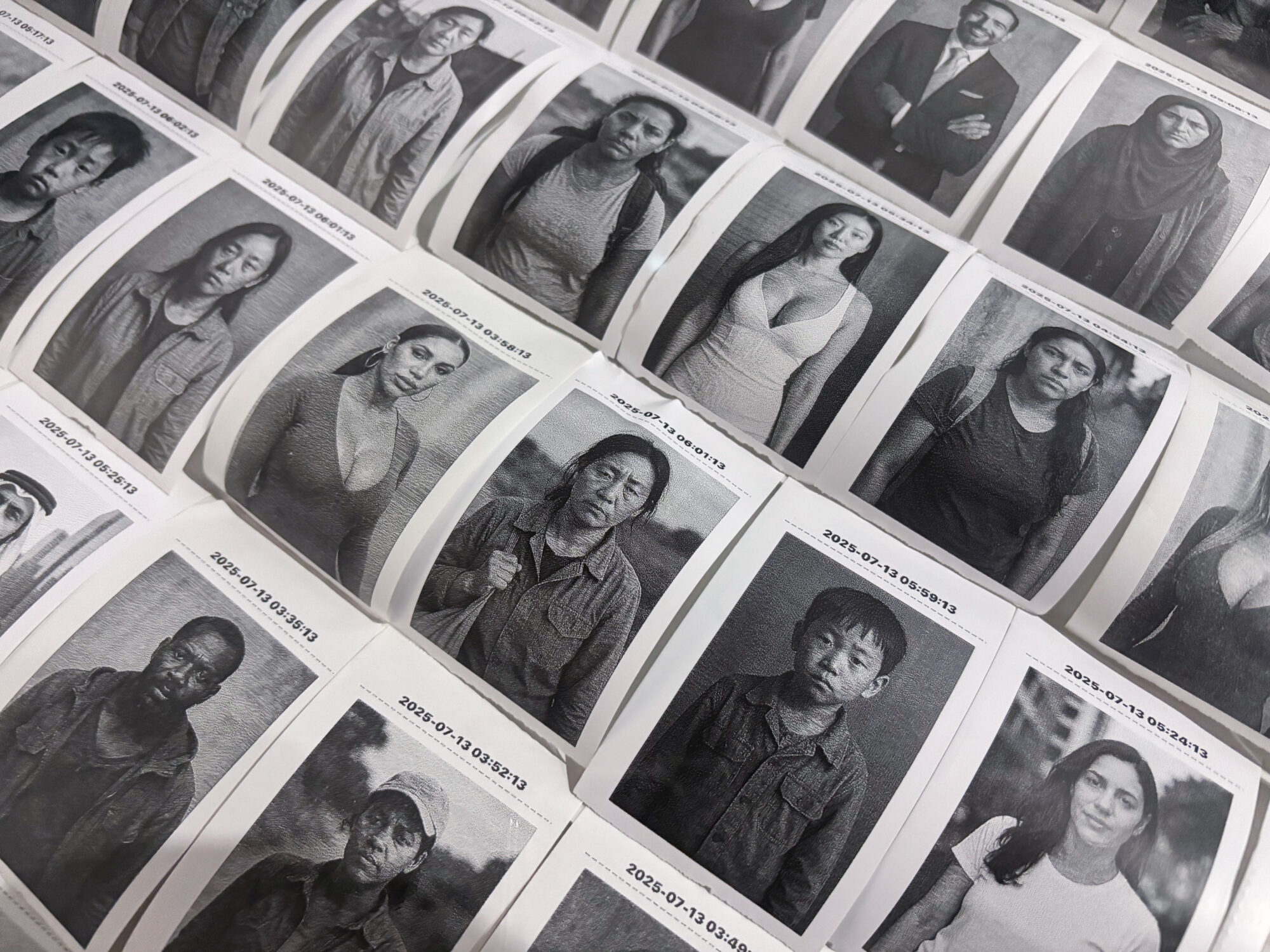 Componer una geografía de identidades reducidas al trazo térmico de una máquina –sin color, sin firma, sin huella– solo es una reinterpretación cruda de ese borramiento que empieza por los papeles, pero que avanza en lenguaje, cuerpo y trato. Ser migrante se vuelve condición de sospecha, y el rostro, apenas percibido, se olvida, se deshumaniza.