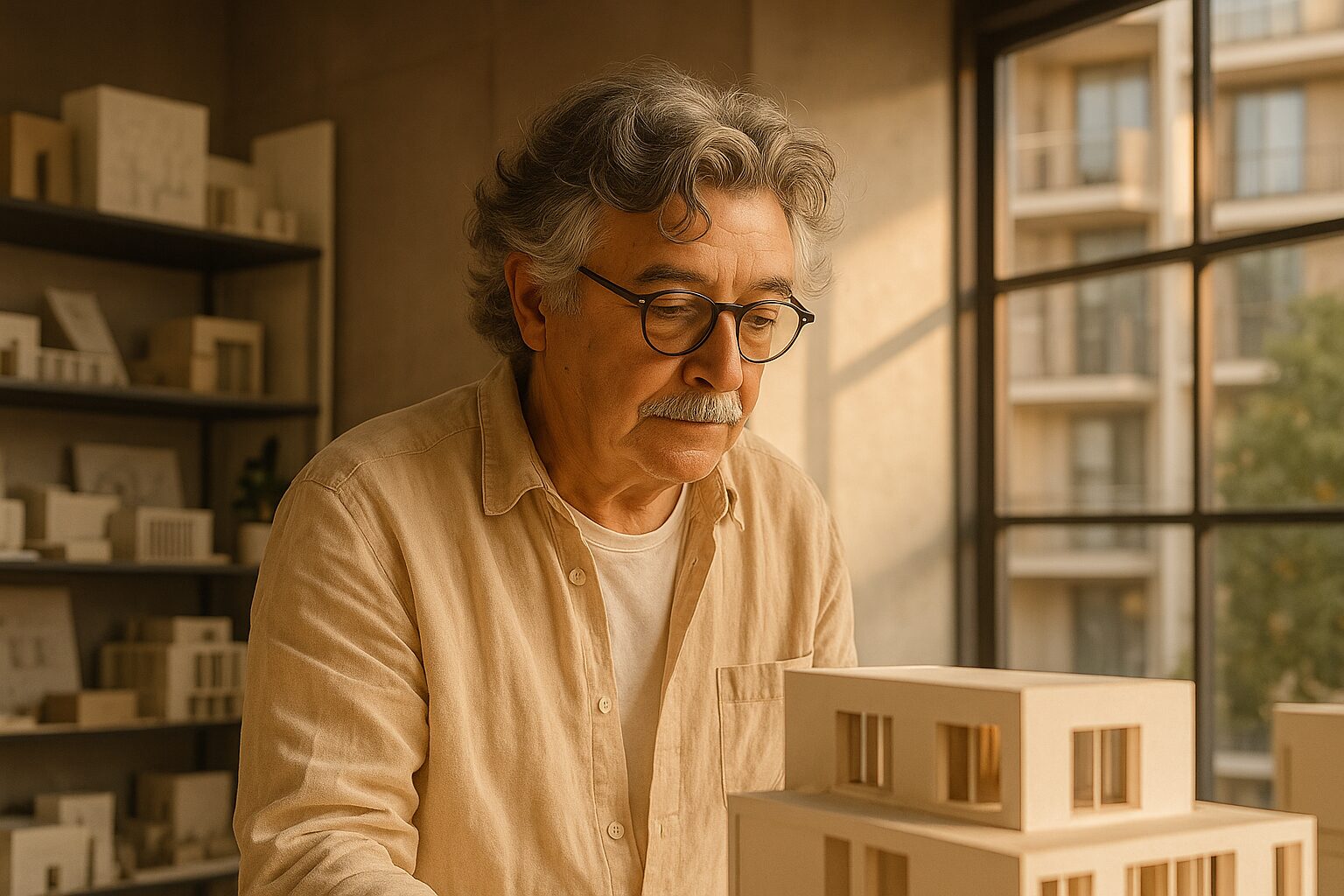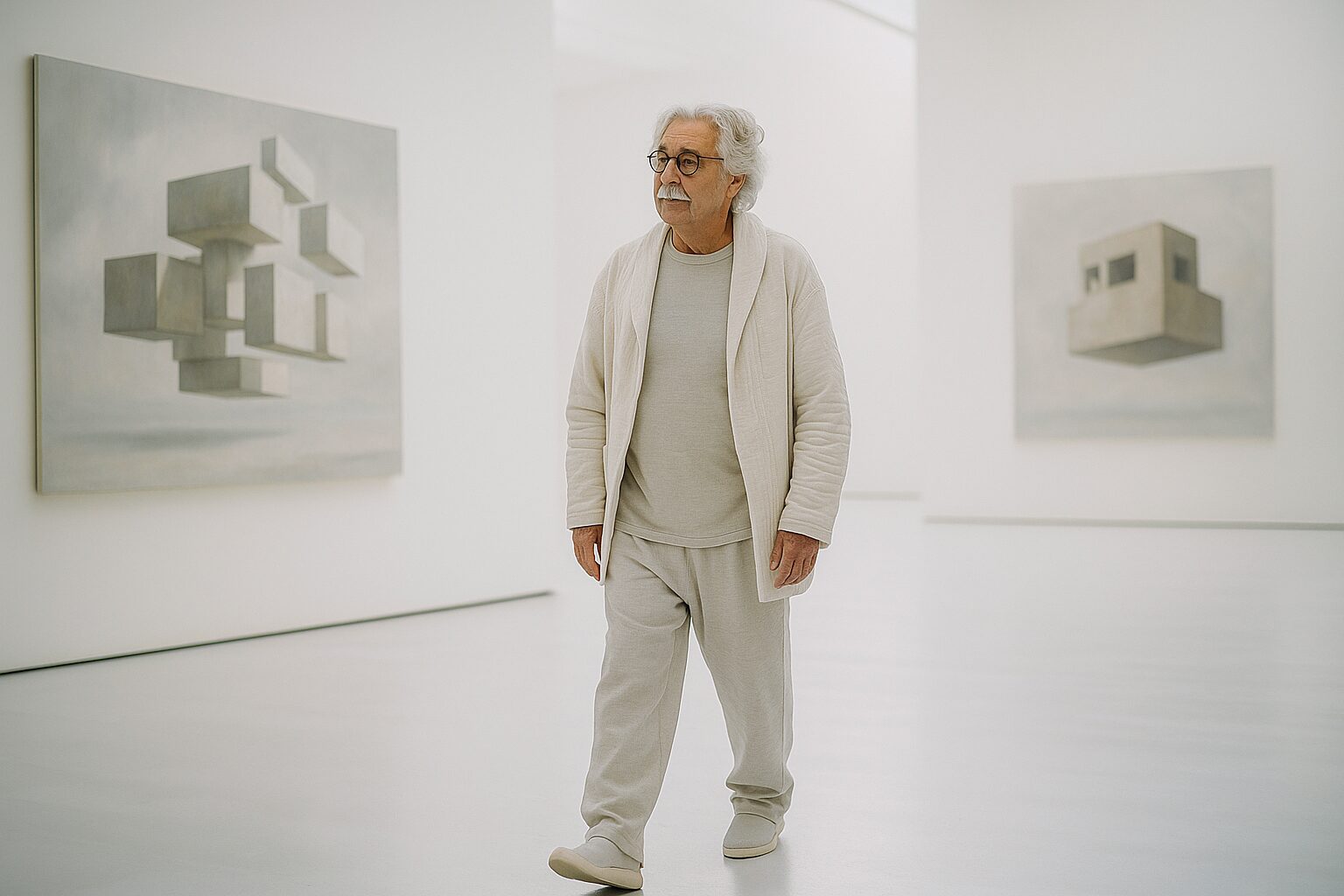 Sí, bueno, ha sido una evolución. En mi obra no ha habido rupturas así abruptas, de lenguaje, de cambios. Siempre una cosa ha ido como difuminándose en otra, como una especie de fundido, ¿no? Y así ha progresado ella. Pues a partir de una obra que era abstracta, luego con unos dibujos como unos rimeros de papel que se movían en el espacio, en un espacio vacío, que ese espacio comenzó a convertirse en un hábitat poco a poco. Y allí emergió un centro de interés en lo que es la arquitectura y los volúmenes, que hasta ahora, ya no sé, 60 años después, ha desembocado en lo que hago hoy.